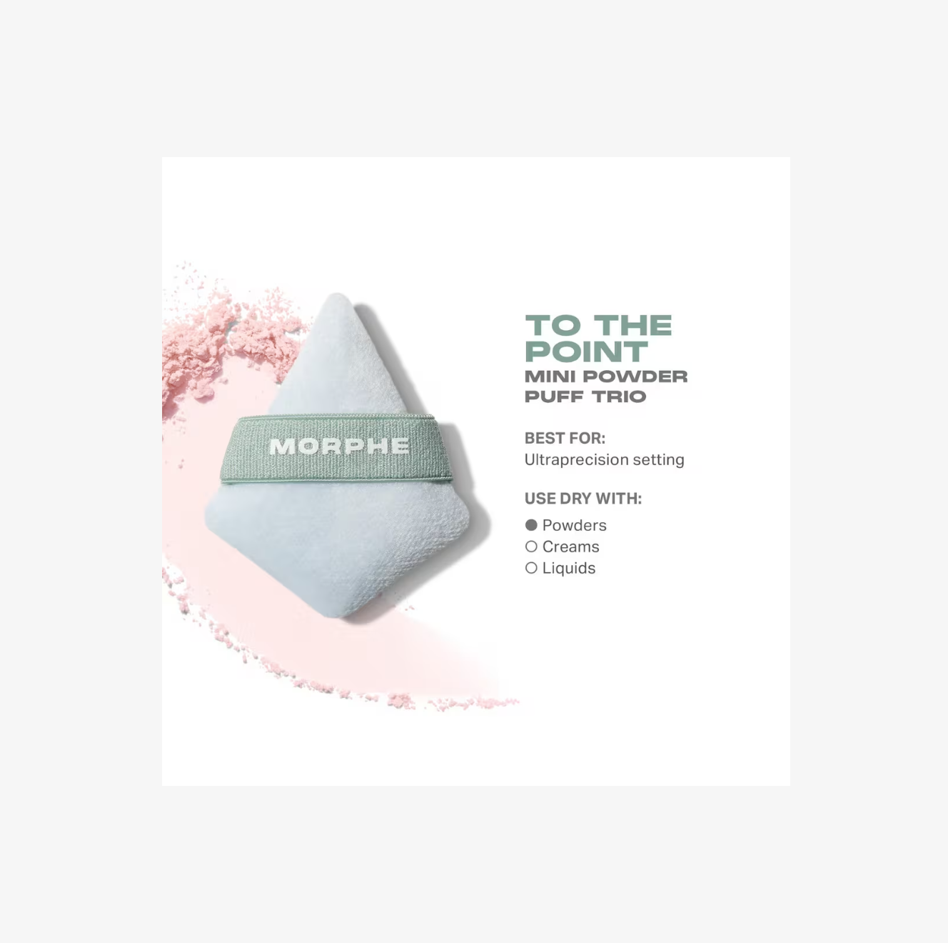 El To the Point Mini Powder Puff Trio de Morphe incluye tres mini borlas en forma de diamante para un acabado ultra preciso al aplicar polvo. El material suave recoge y deposita el polvo perfectamente, mientras que la punta permite presionar el polvo en áreas difíciles como debajo de los ojos.