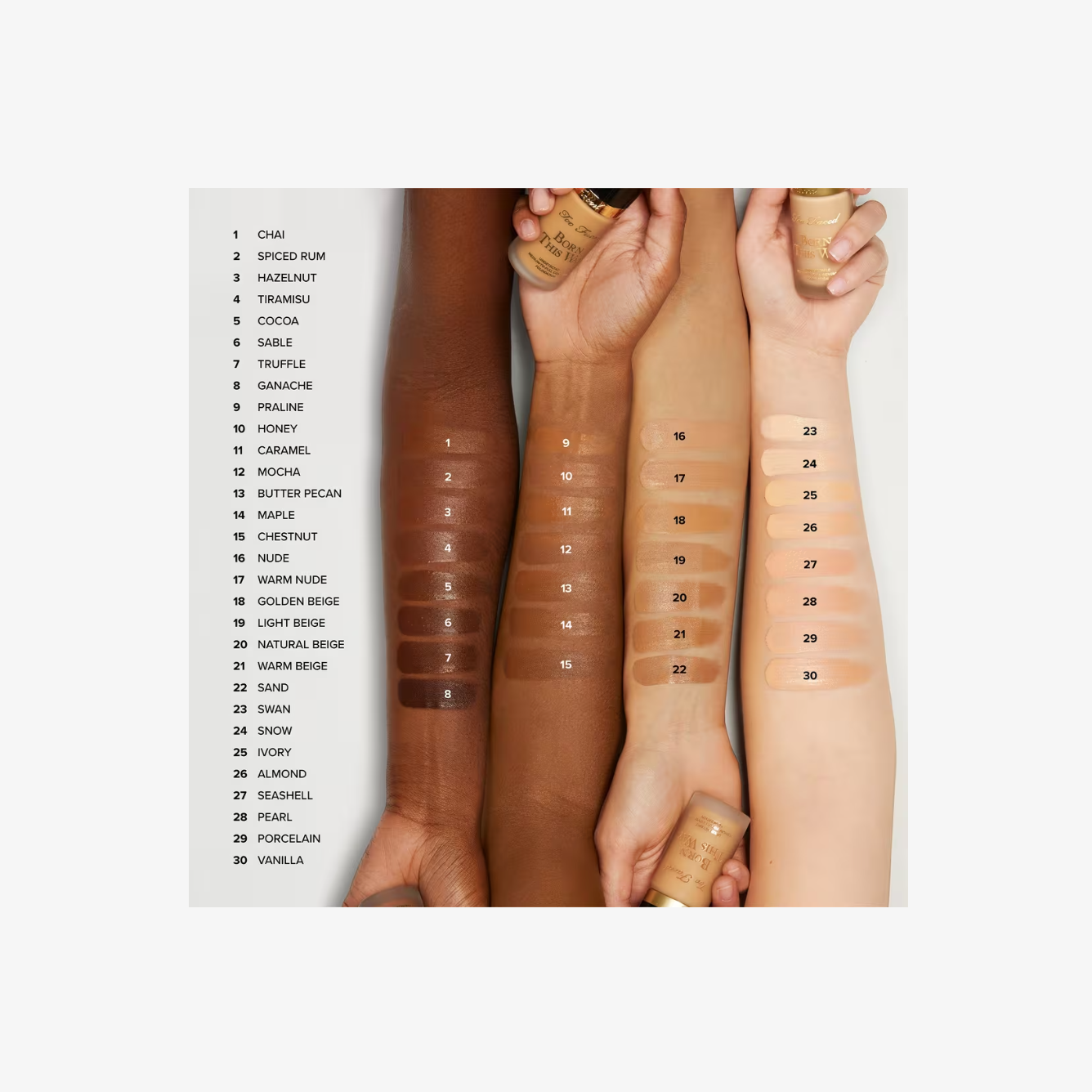 La base Born This Way de Too Faced ofrece una fórmula de cobertura media a completa que brinda 24 horas de hidratación y un acabado de color real, resistente a la transferencia, al agua, al sudor y a la humedad.