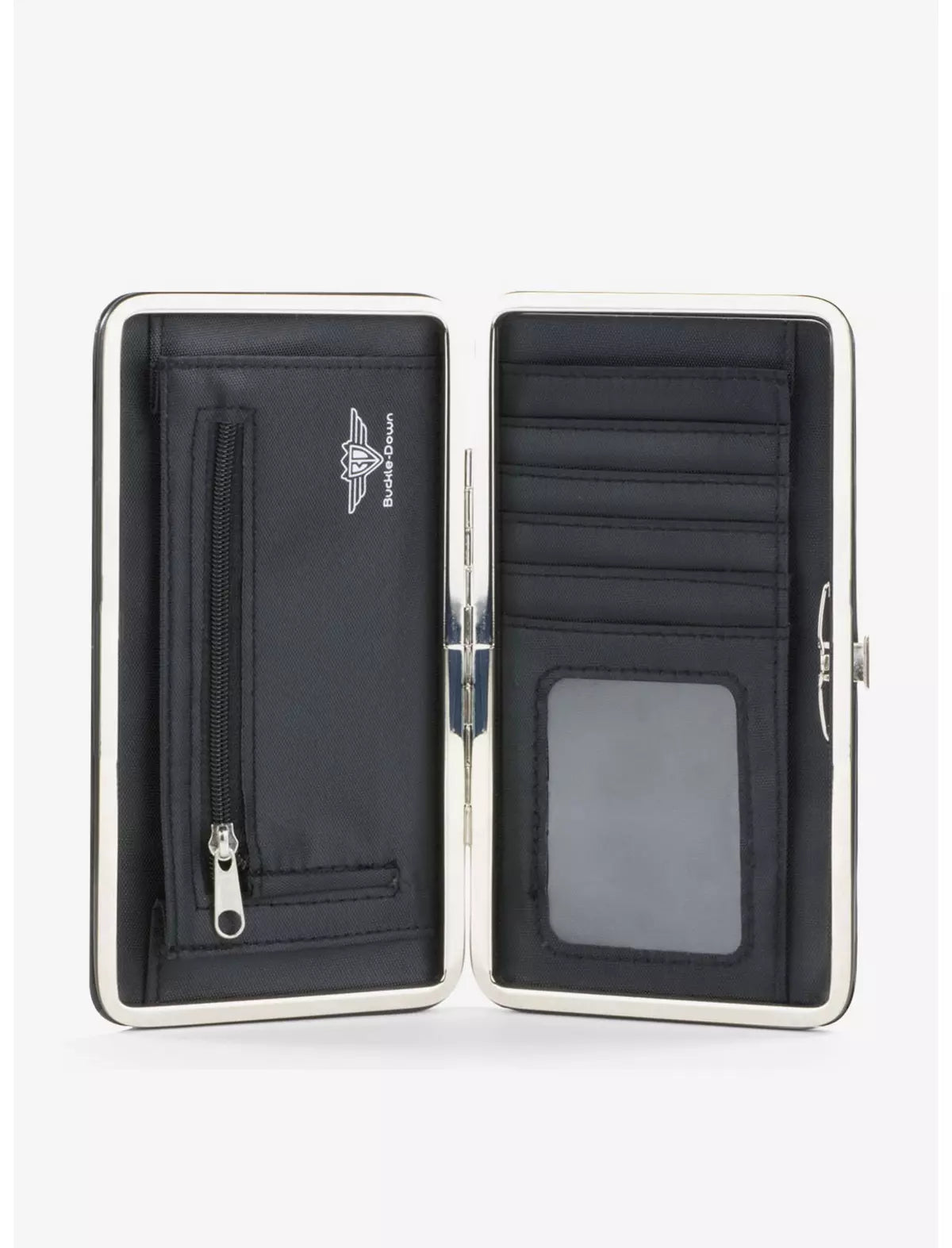 - Elegante y elegante, esta billetera con bisagras está hecha de cuero vegano y acero inoxidable. Mide 7 x 4 x 0,75 pulgadas, con 2 billeteras, 4 ranuras para tarjetas y un soporte para identificación con ventana.