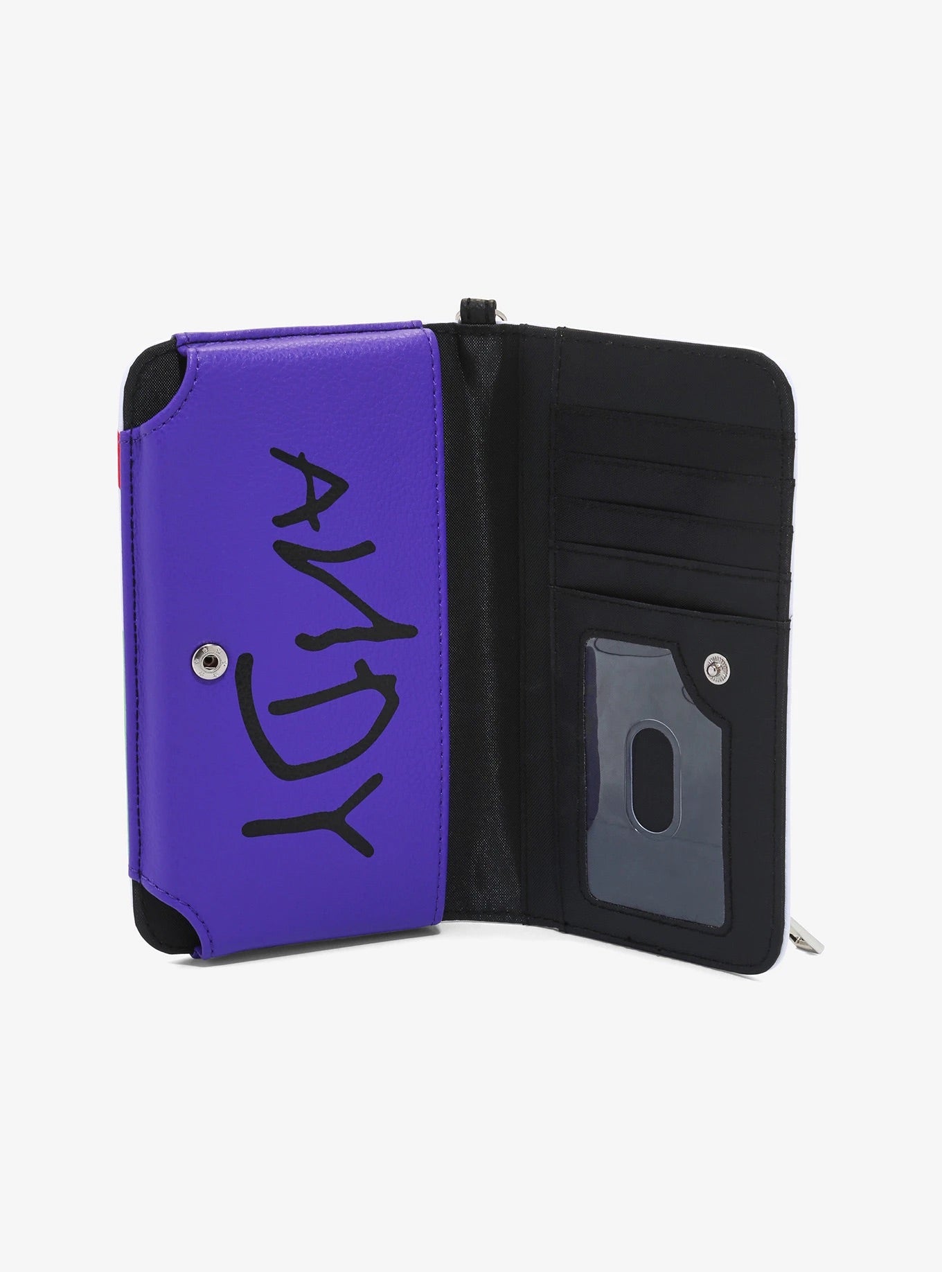 Hay una funda morada para sostener el dispositivo de su teléfono inteligente con el diseño de texto "Andy", ¡como en el pie de Buzz!