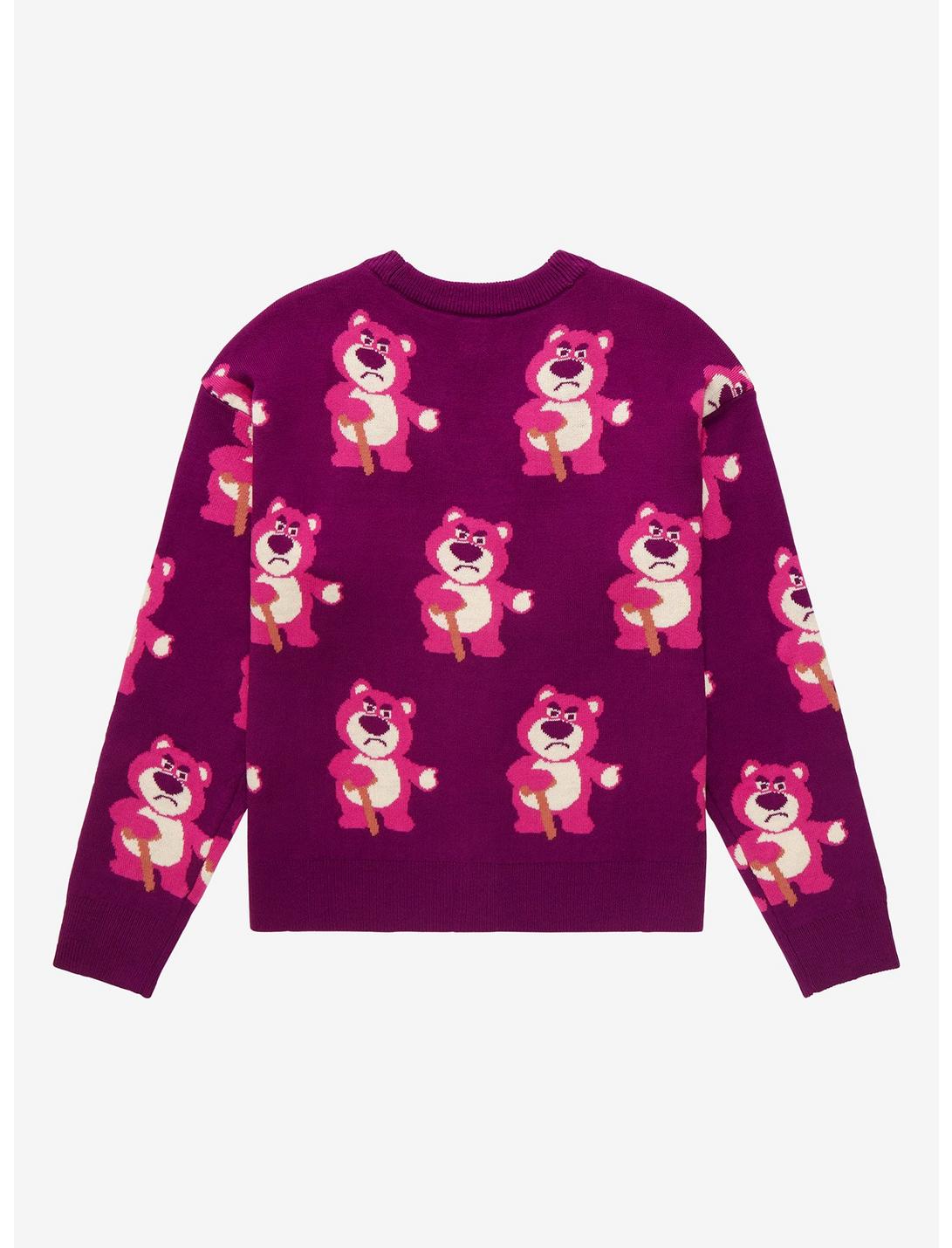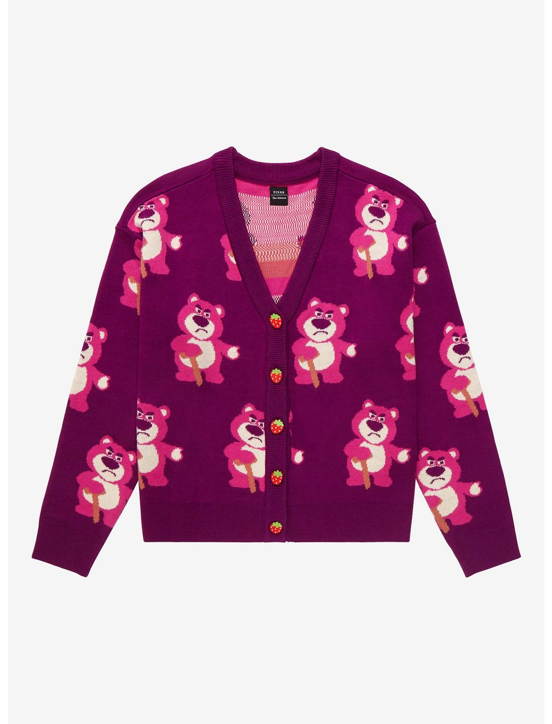 ¡Agregue un aspecto encantador de bayas a su guardarropa con un poco de ayuda de Lotso Huggin 'Bear! Visto como un estampado integral gruñón en este cárdigan, Lotso tiene su característico bastón en la mano, listo para acompañarlo en su próxima aventura. También cuenta con botones en forma de fresa para unir su estilo Toy Story.