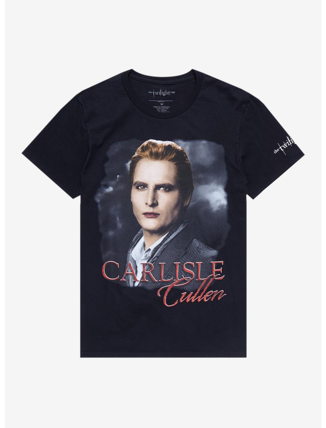 Olvídese del equipo Edward y el equipo Jacob, ¡todos somos Carlisle! Luce esta camiseta de Crepúsculo antes de programar una cita con tu médico favorito. Presenta a Carlisle Cullen sobre un fondo tormentoso, con su nombre en rojo sangre debajo.