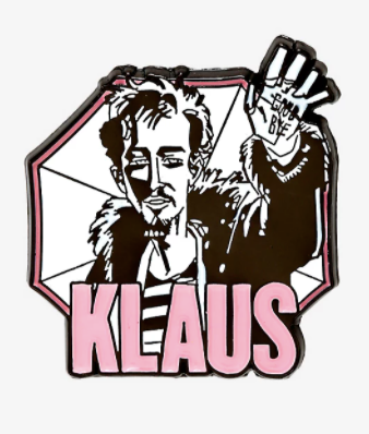 Los espíritus han hablado ... necesitas otro pin de The Umbrella Academy para agregar a tu colección. Presenta una imagen ilustrada en blanco y negro de Klaus Hargreeves con su nombre en rosa.