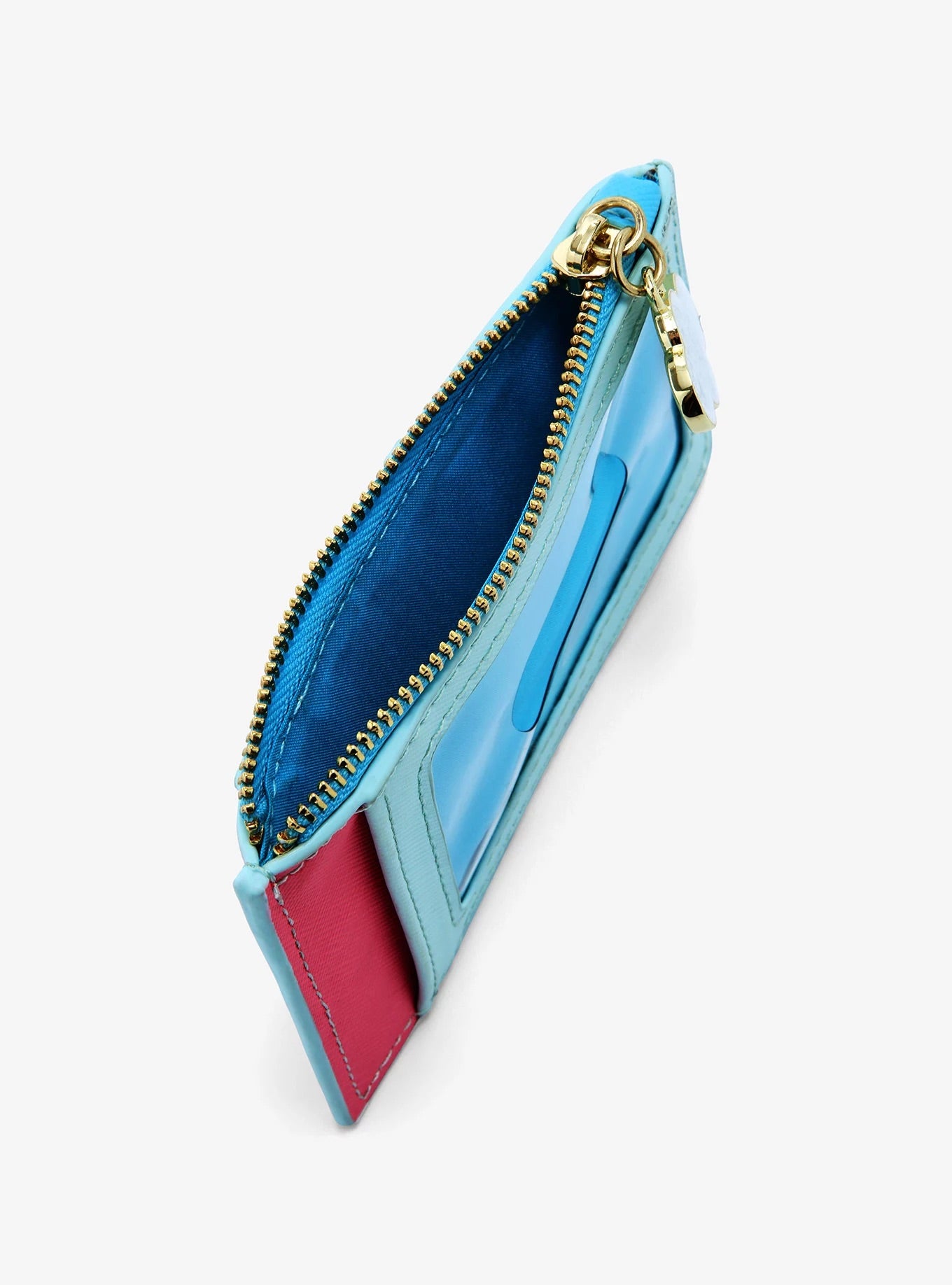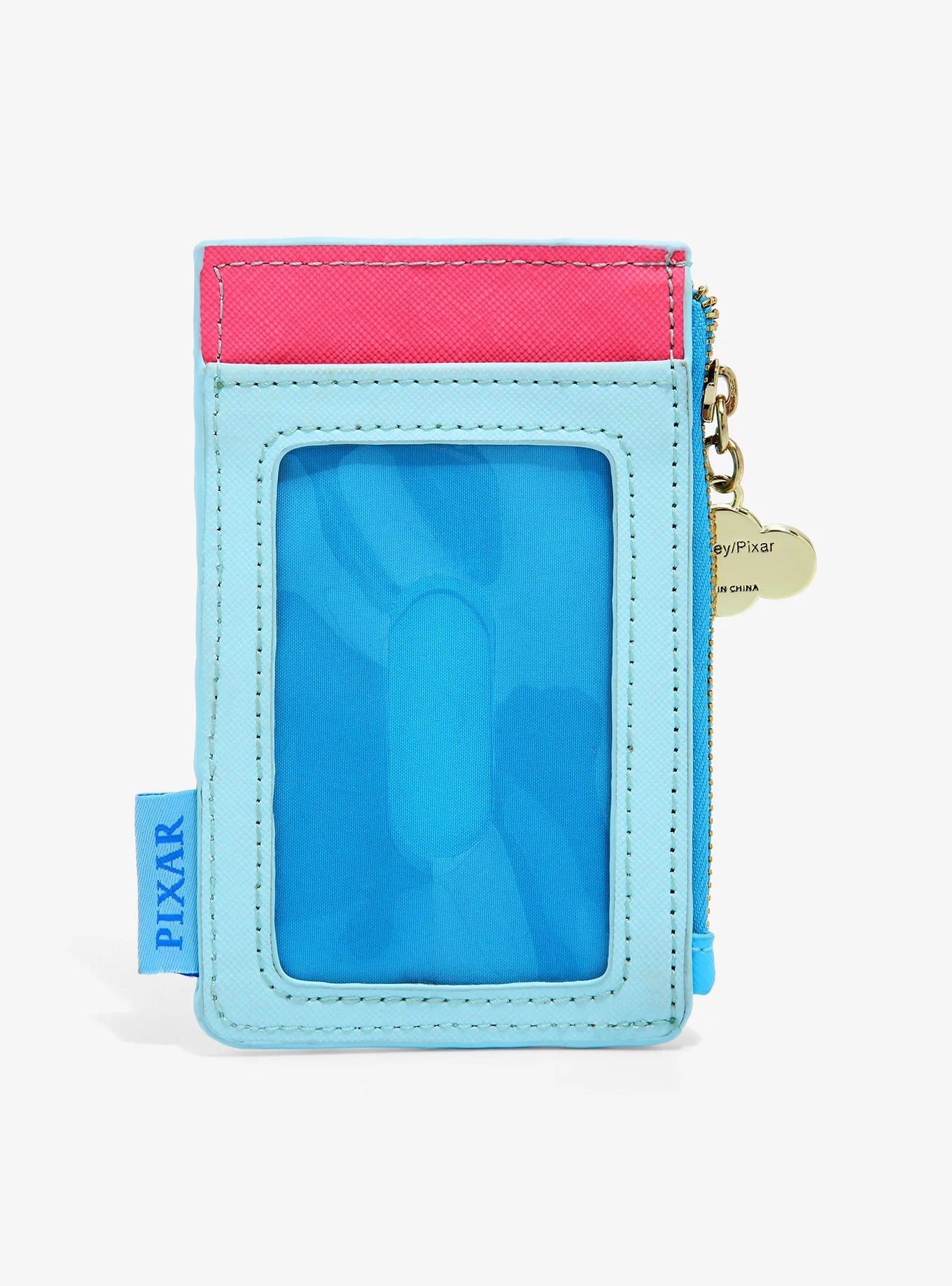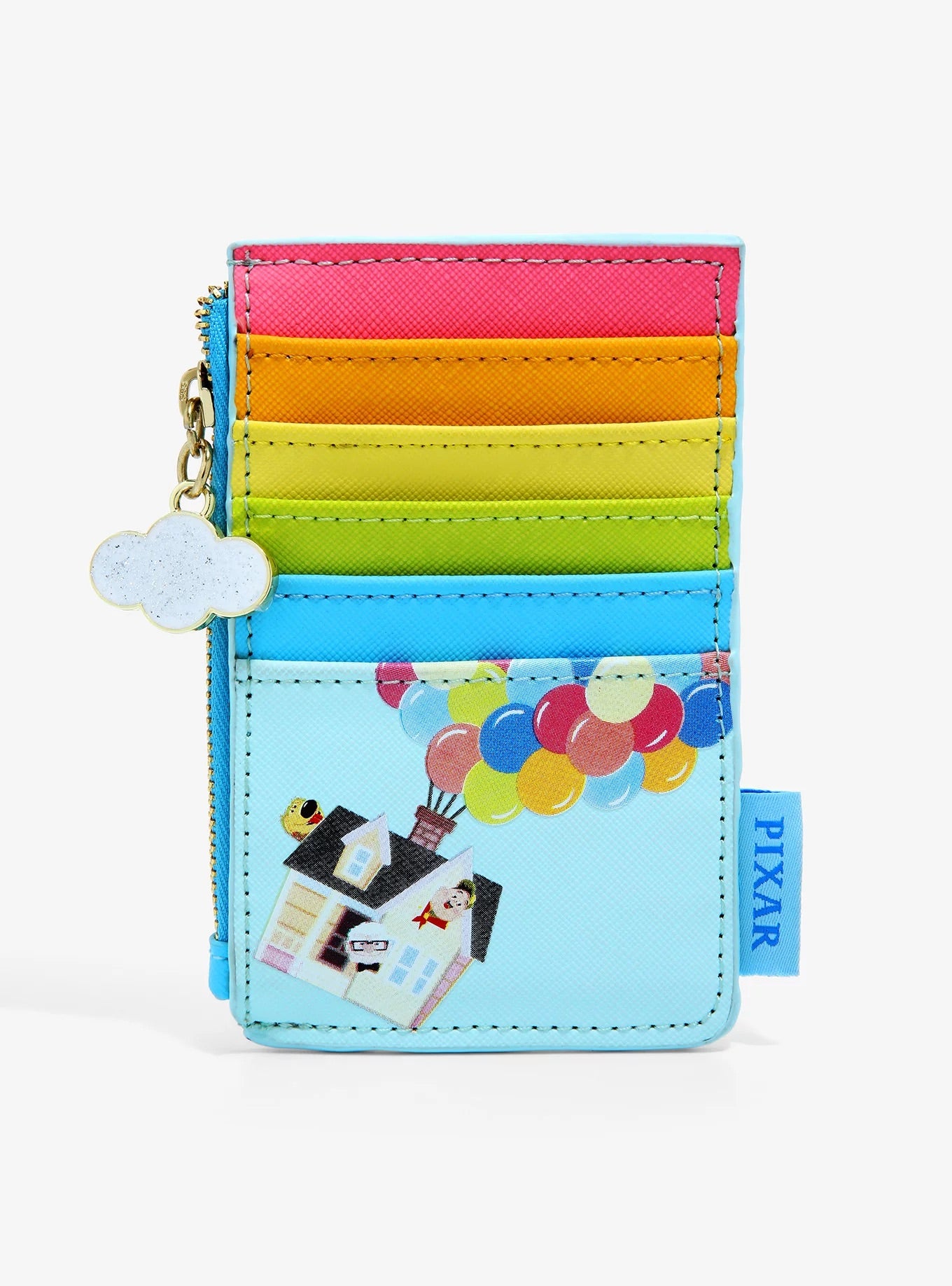 ¡Arriba, arriba y lejos! La casa voladora de Disney • Pixar's Up está en camino a Paradise Falls, ¡y puedes unirte a la aventura con este titular de la tarjeta! Carl, Russell y Dug se asoman desde la casa flotante en un gráfico debajo de cinco ranuras para tarjetas de arco iris, ¡tan coloridas como los globos de Carl! El reverso cuenta con una ranura para identificación transparente y el lateral cuenta con una bolsa con cremallera para monedas con un dije de cremallera en forma de nube.