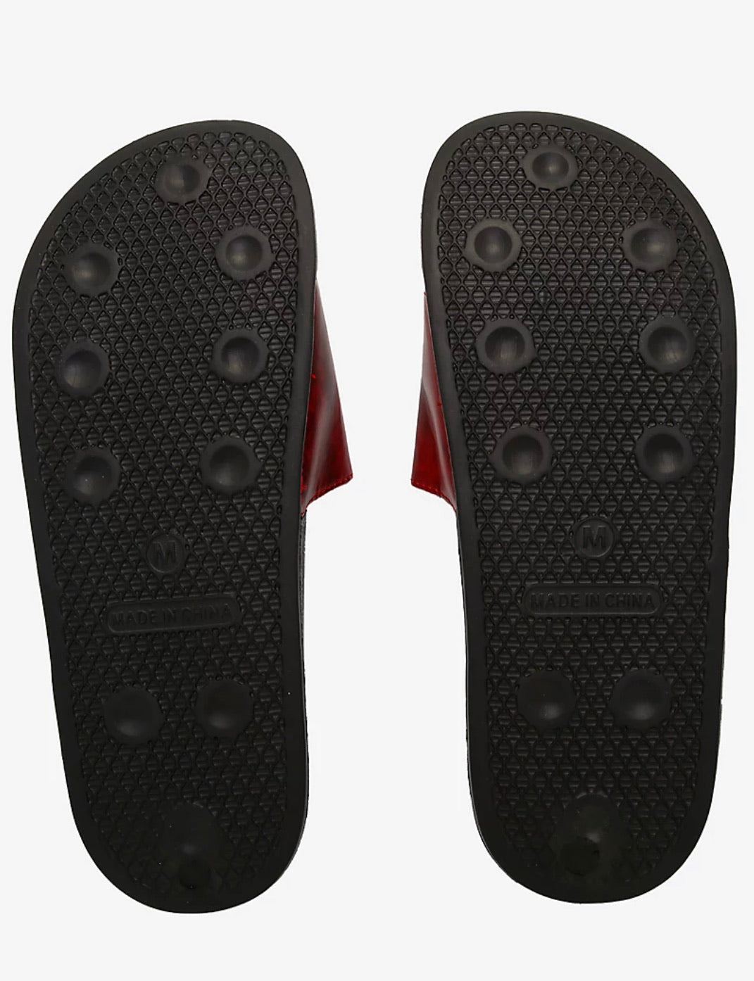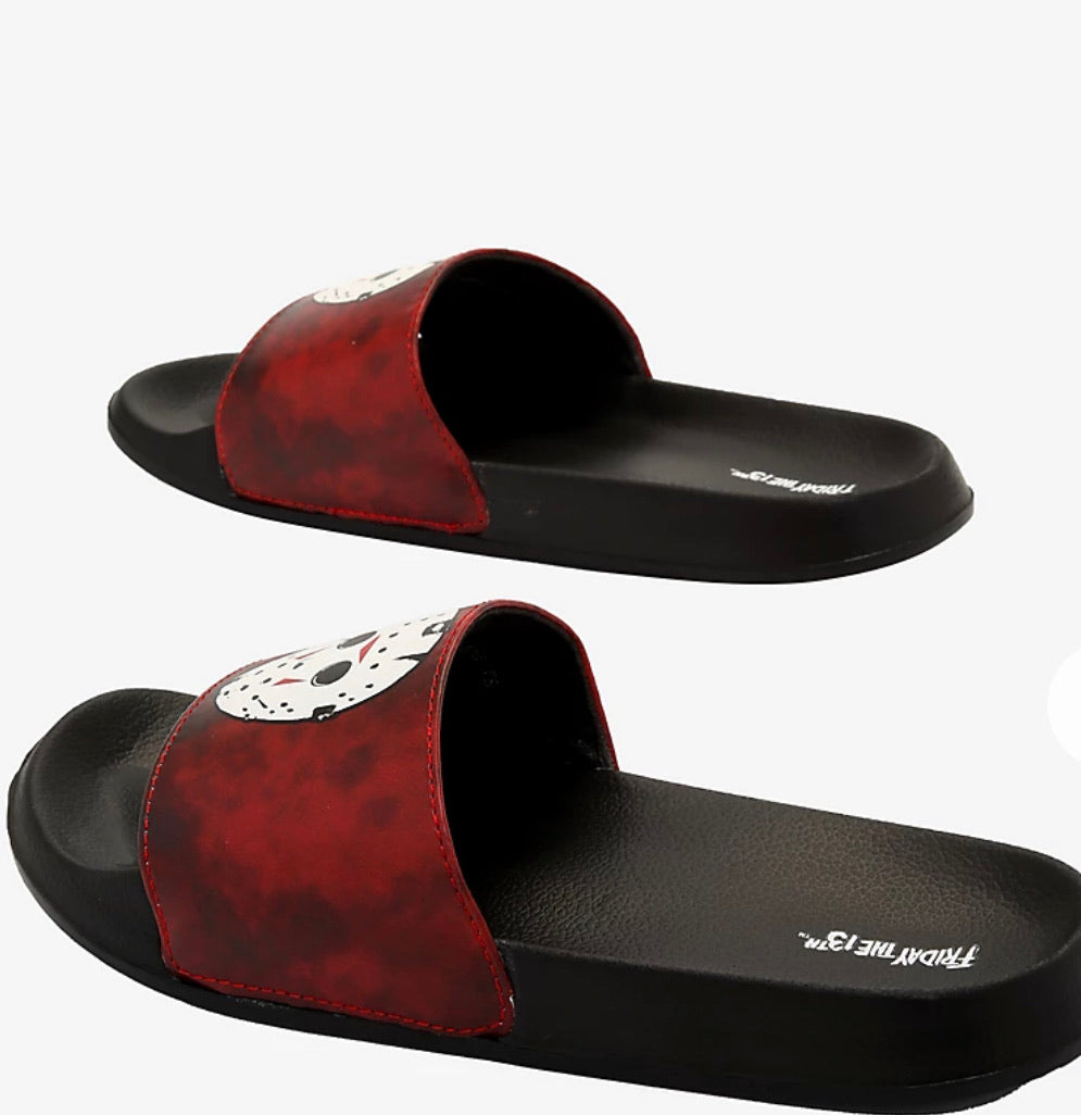 ¿Vas a Camp Crystal Lake? ¡Necesitarás unos zapatos junto al lago! Estas diapositivas rojas y negras del viernes 13 están impresas con la máscara de Jason en cada banda. Perfecto para relajarse junto al agua ... no tanto para huir de un asesino en serie enmascarado en el bosque.