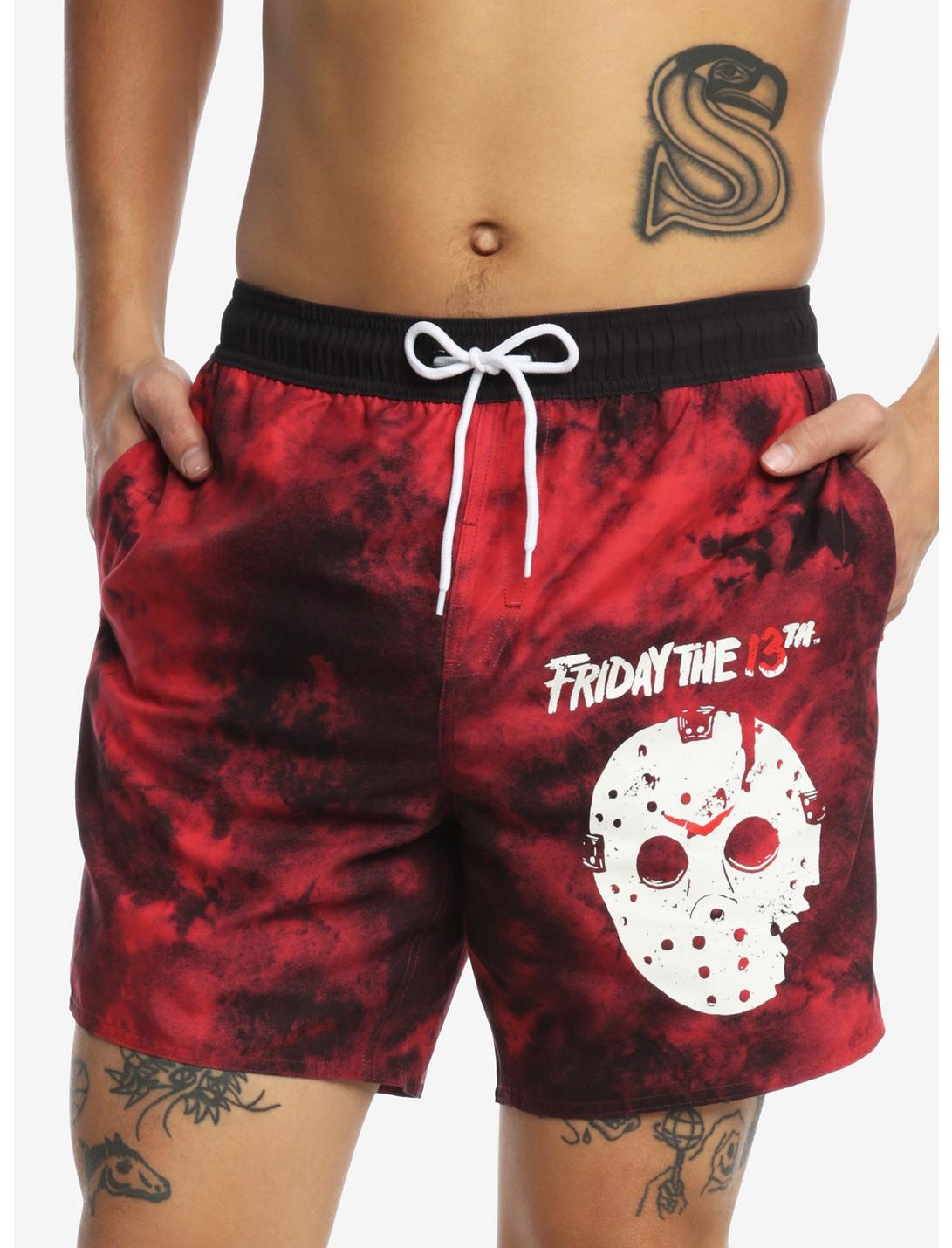 ¿Salir a darse un chapuzón refrescante en Crystal Lake? ¡No olvides usar tu traje de baño de Viernes 13! Estos calzoncillos tienen un lavado rojo y cuentan con la máscara de Jason en la pierna izquierda con el título de la película arriba. Viene con forro de malla, bolsillos en la cadera, bolsillo trasero derecho y cintura elástica con cordón.