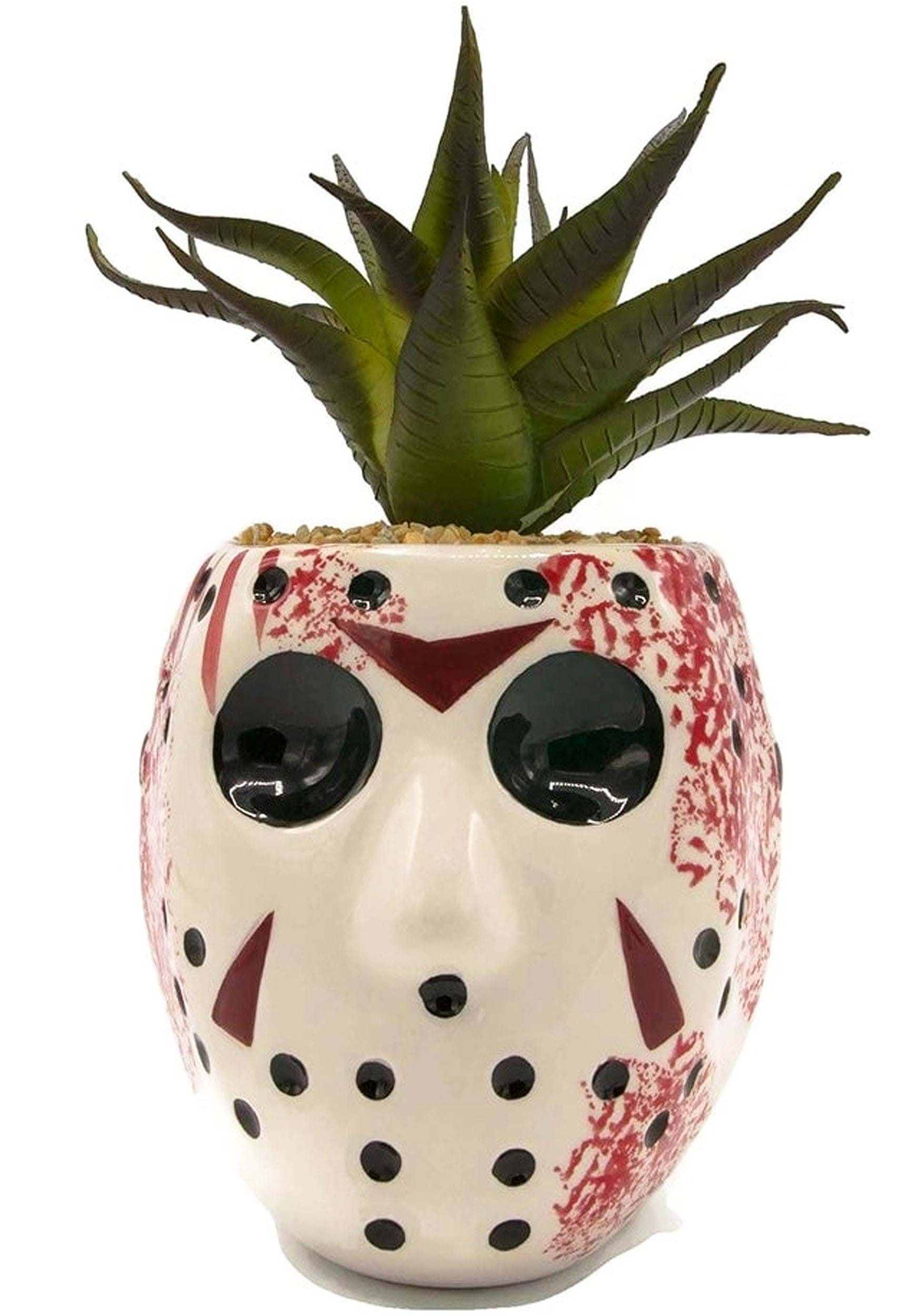 - Puede que te sorprenda, pero Jason tiene bastante talento para la jardinería. Claro, por lo general anda cortando cosas con un machete. ¿Tal vez solo está buscando fertilizante? No defenderíamos las elecciones del chico, ¡pero deberías ver su jardín! Esta maceta de cerámica Jason Mask es solo un ejemplo del arte que maneja. ¡Sospechamos que podrías lograr algo increíble tú mismo! (La plantación. No las travesuras de Crystal Lake).