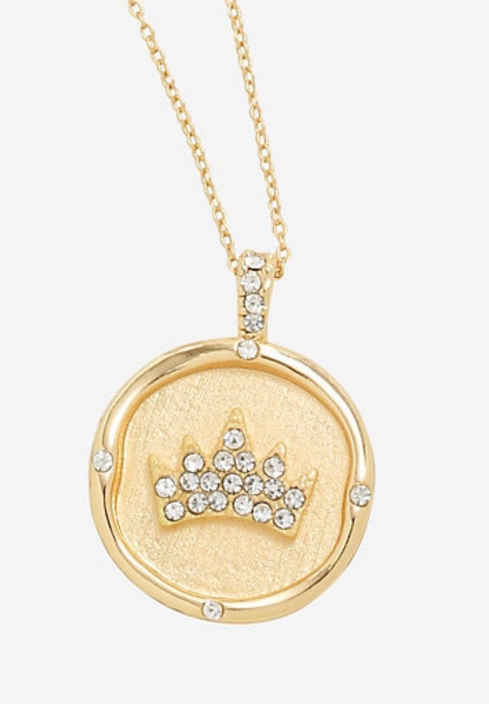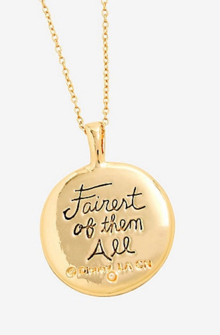 ¡Usa el collar más hermoso de todos! Inspirado en Blancanieves y los siete enanitos de Disney, este collar de tono dorado presenta un encanto de corona incrustado de gemas y letras grabadas "Fairest of them All". Chapado en plata fina