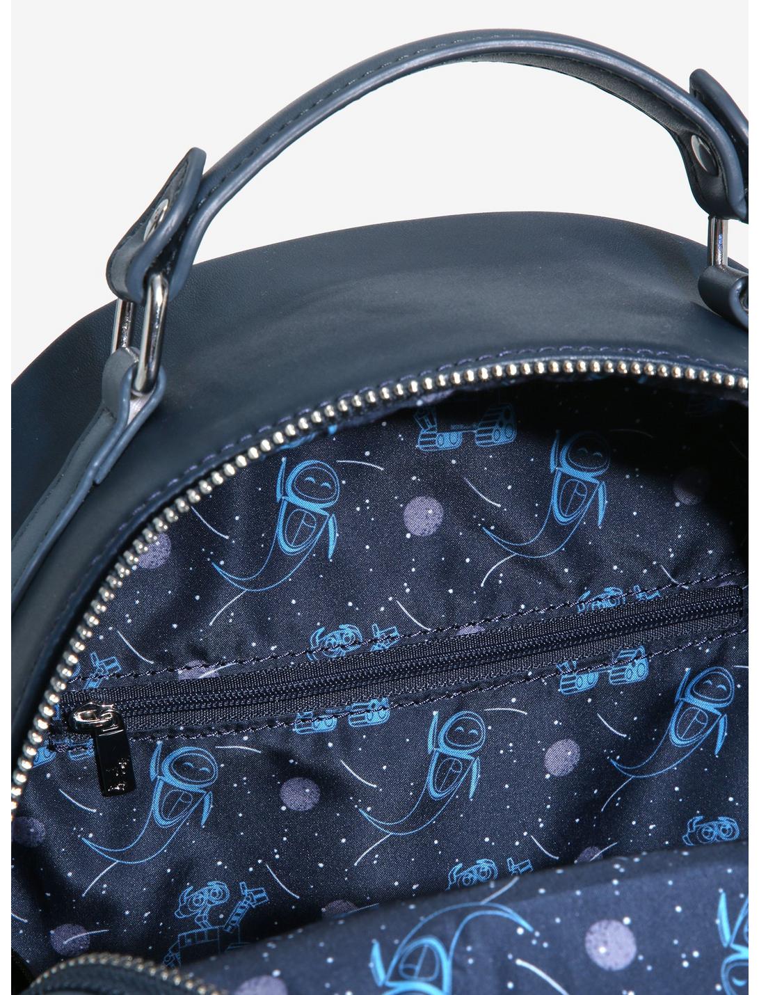 ¡Lleva tu juego de accesorios a la luna con esta mini mochila de Loungefly! Inspirados en la querida película animada, WALL•E, WALL•E y EVE posan tomados de la mano frente a una luna en forma de corazón en el bolsillo delantero de este bolso para lograr un estilo adorable de Disney•Pixar. También cuenta con una insignia esmaltada de la marca, herrajes plateados, un patrón de forro interior con tema del espacio exterior y tiradores de cremallera esmaltados con el indicador del logotipo de la planta de EVE.