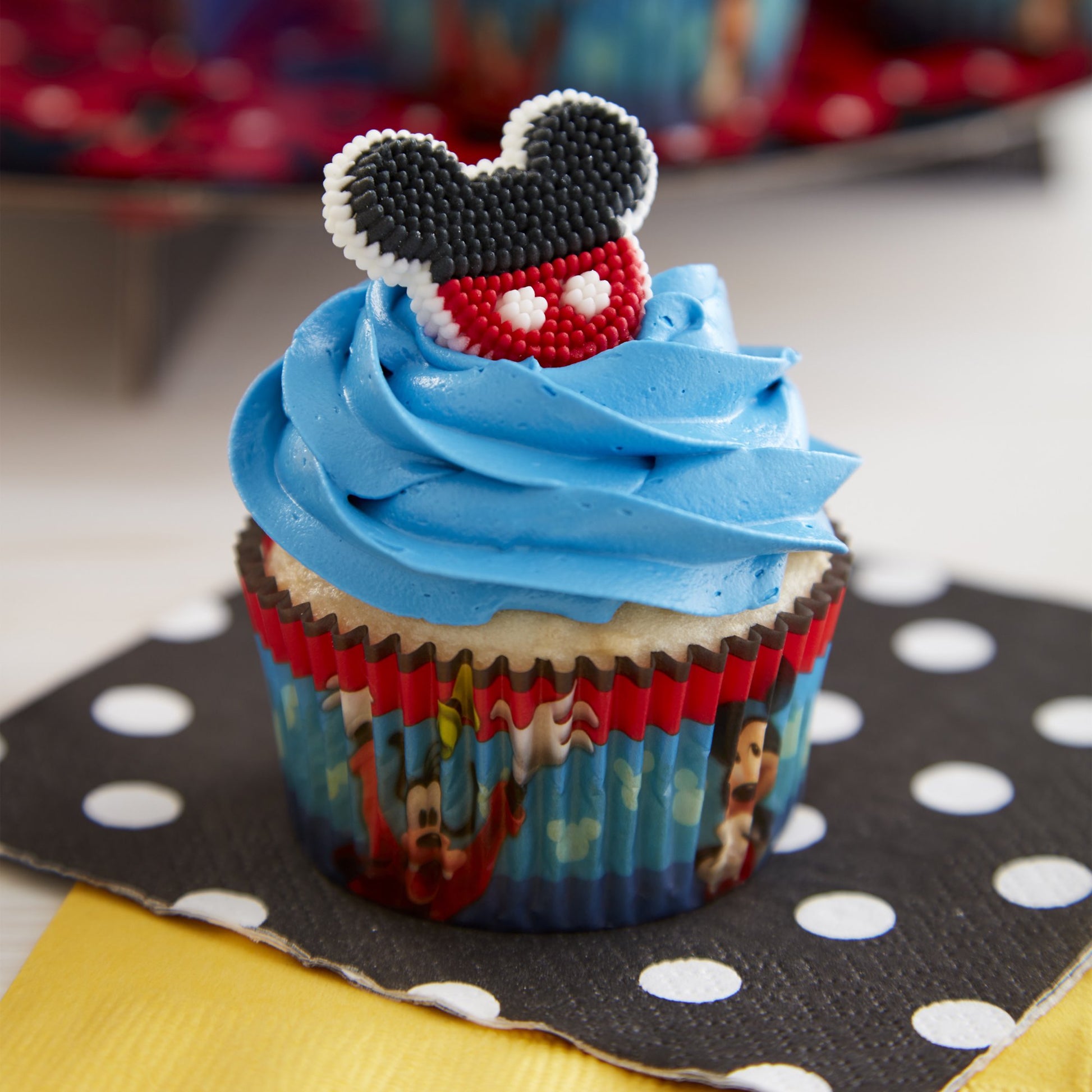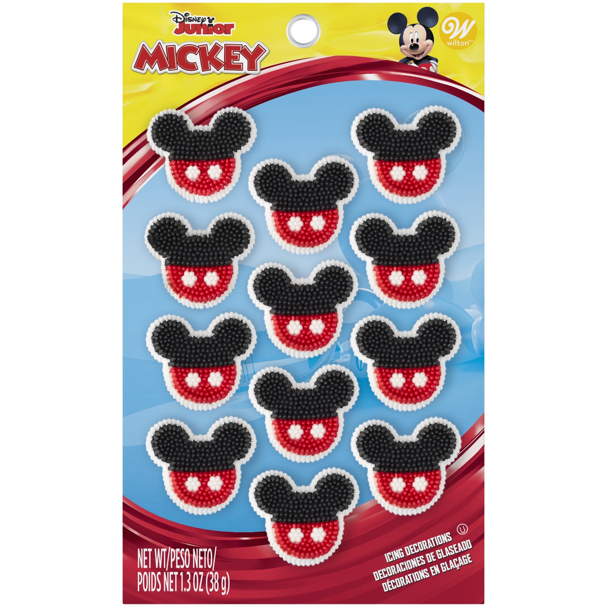 Decoraciones de glaseado real con la forma del logotipo de las orejas de Mickey Mouse con los característicos pantalones rojos y dos botones
