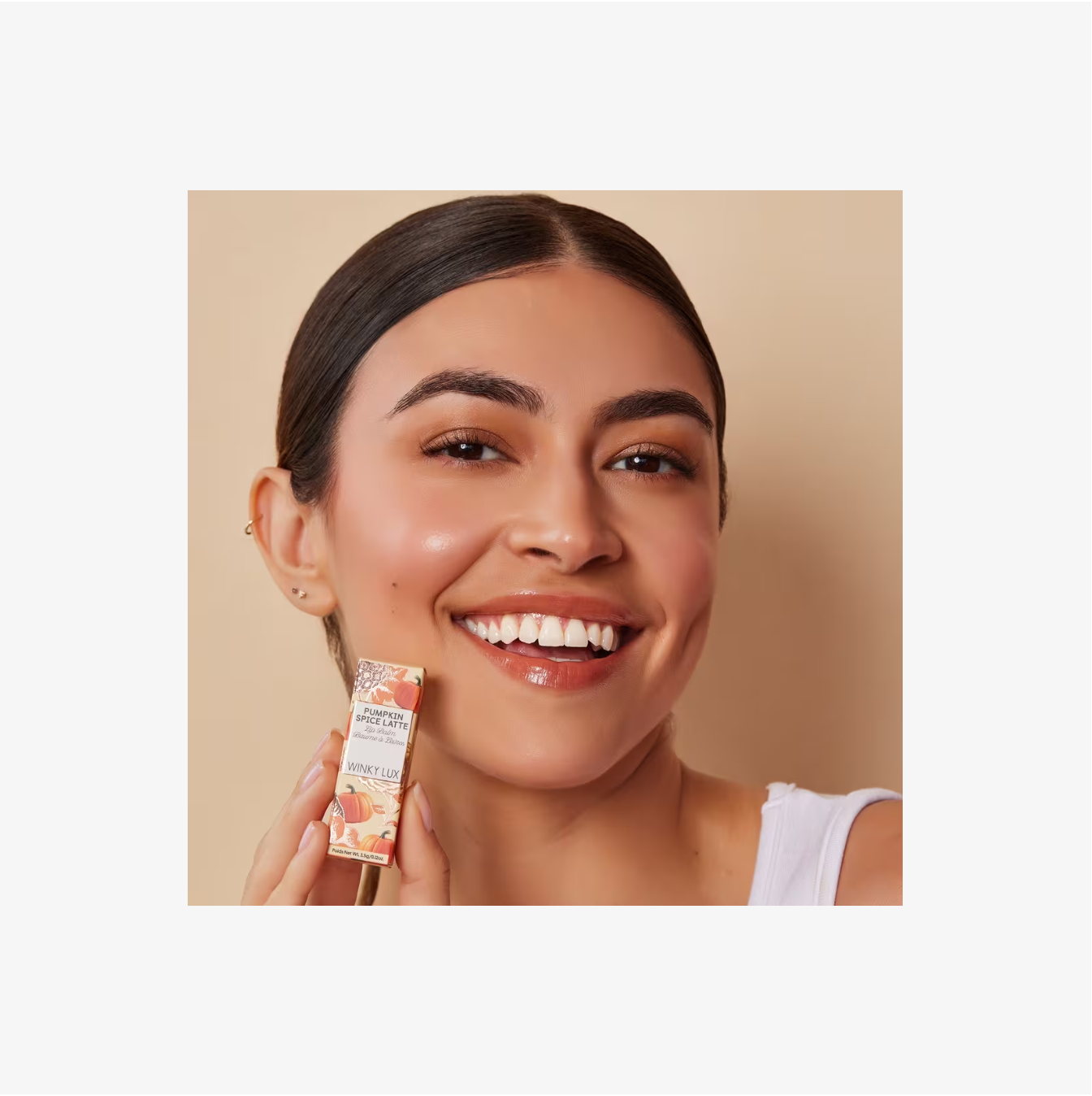 Inspirado en los reconfortantes sabores del pumpkin spice latte, el Winky Lux Pumpkin Spice Latte Lip Balm es un bálsamo teñido en tono nude con canela, enriquecido con aceite de jojoba y vitamina E. Este bálsamo envuelve los labios en hidratación y un aroma deliciosamente irresistible.