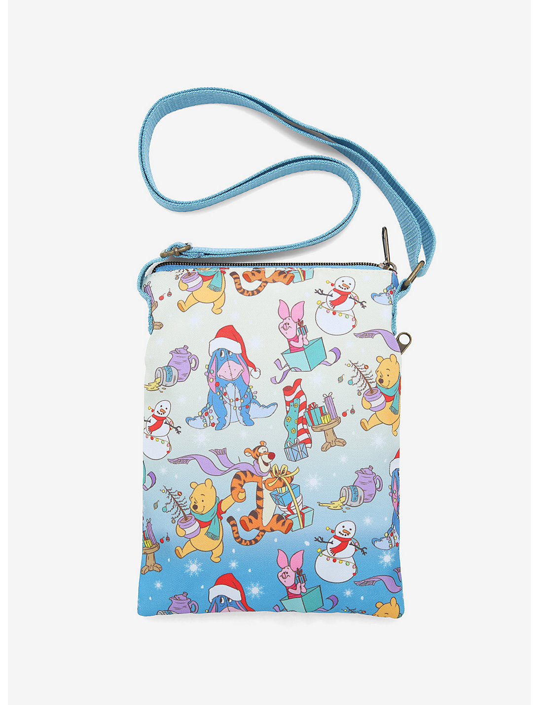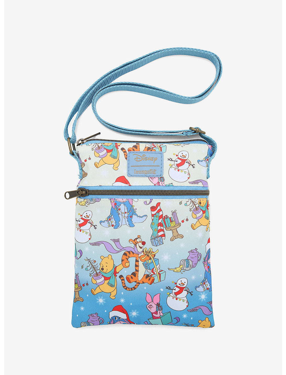 ¡Decora los pasillos con Pooh y amigos! Esta bandolera tipo pasaporte de Winnie the Pooh seguramente traerá alegría al mundo y a su colección de bolsos, con un cielo ombré lleno de copos de nieve y Pooh, Tigger, Piglet y Eeyore preparándose para la temporada navideña. Bolsillo frontal con cremallera, cierre de cremallera superior y bandolera ajustable.