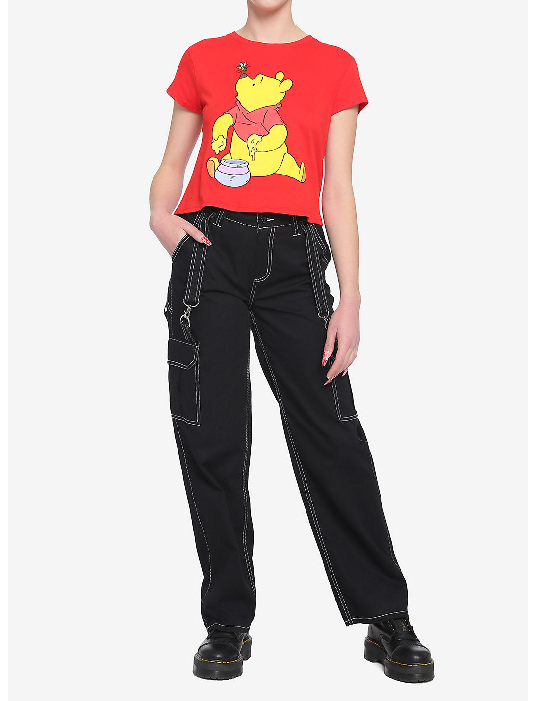 - ¡Oh hermano! ¡Es hora de hacer espacio en tu armario para esta dulce camiseta de Winnie the Pooh! Con tu viejo oso tonto favorito con las manos llenas de cariño, estampado en una camiseta roja corta con dobladillo sin rematar.