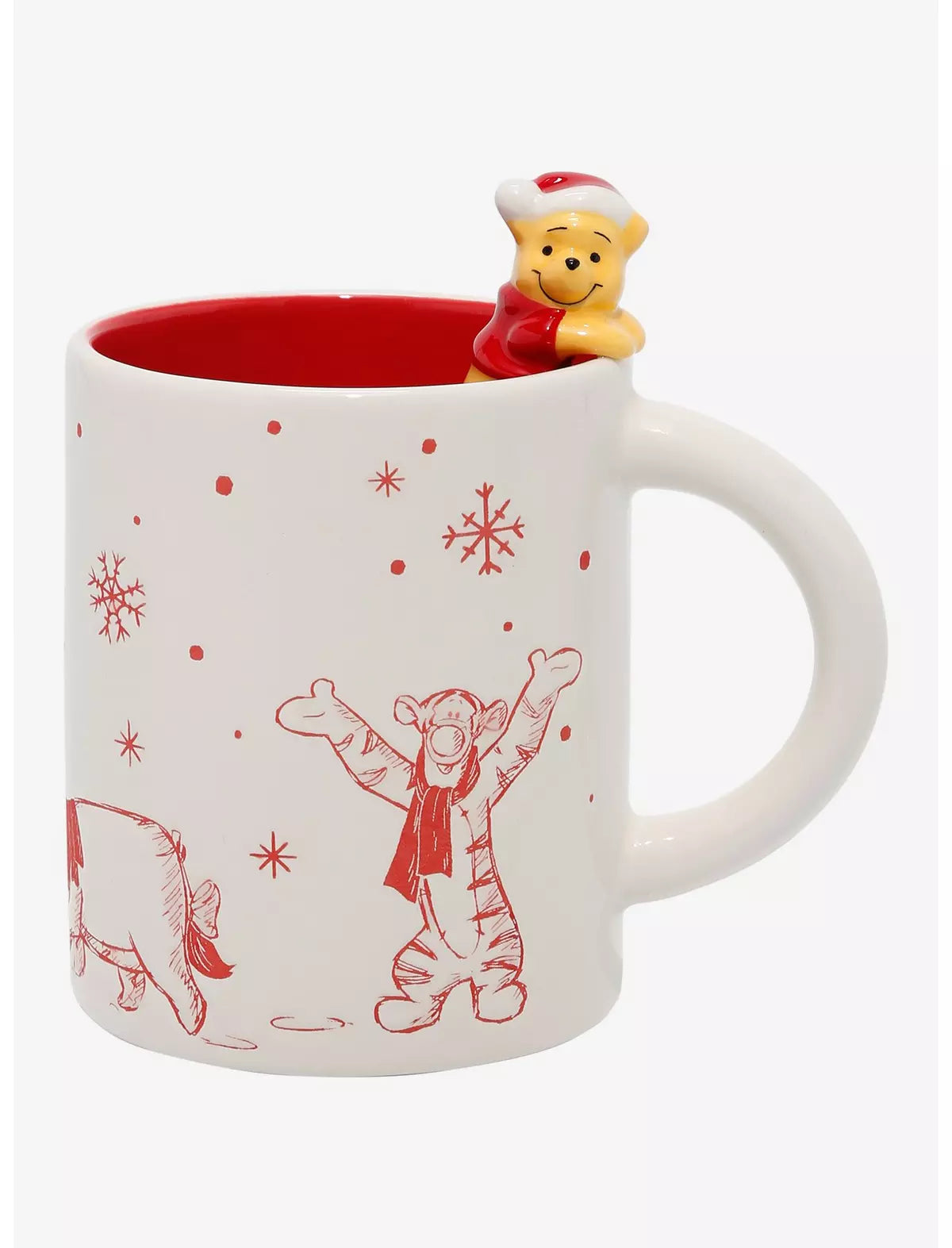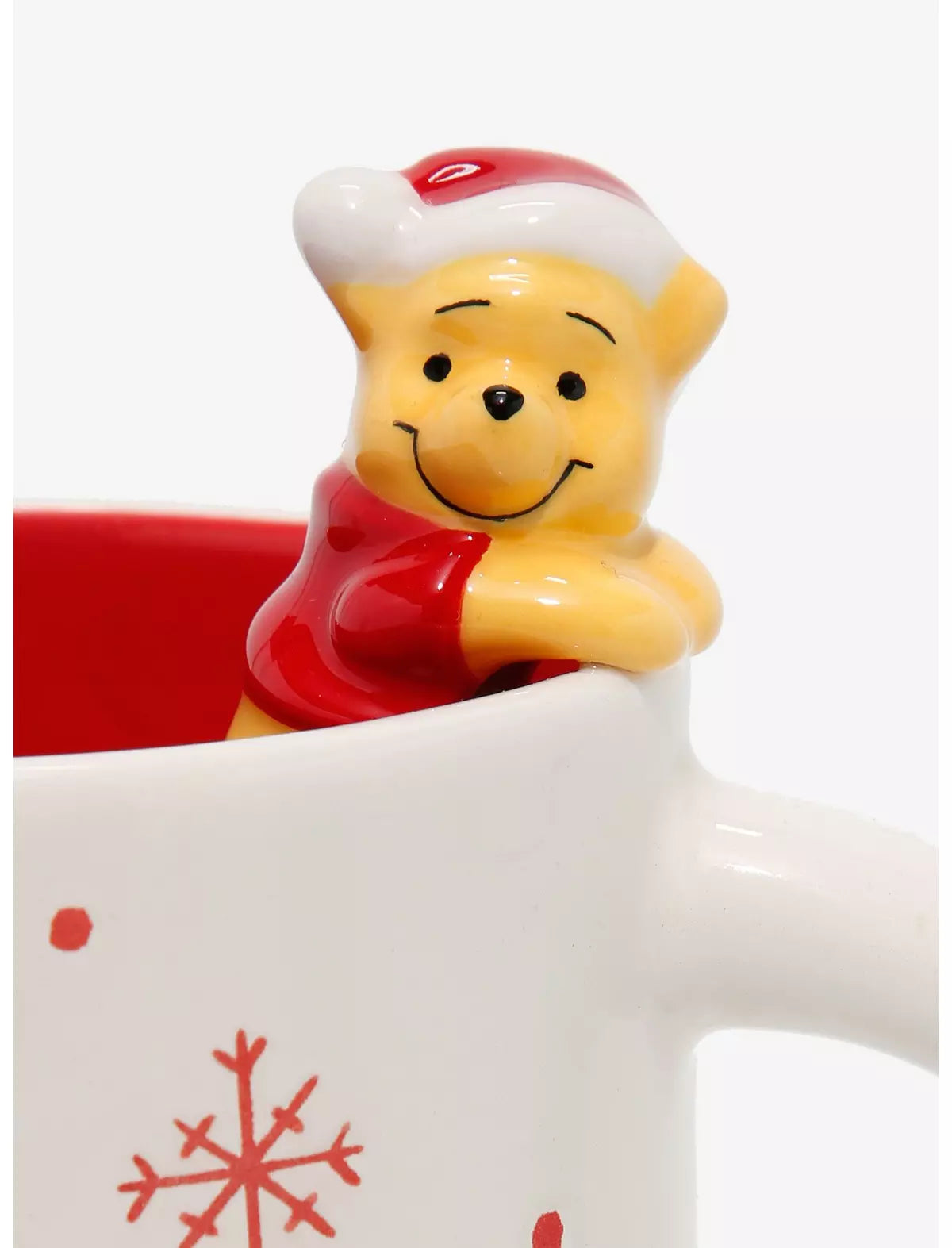 ¡Agregue un poco de espíritu navideño a su mueble de cocina! Esta taza de Winnie the Pooh tiene impreso el oso Pooh y sus amigos con ropa de invierno mientras juegan en la nieve, mientras que una figura de Pooh se pone su gorro de Papá Noel y se aferra al borde.